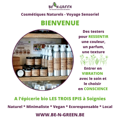 Un soin BE’N GREEN n’est pas qu’un produit : c’est un voyage. Un mouvement vers Soi, un souffle, une parenthèse douce dans le tumulte du quotidien. Les textures, légères ou enveloppantes, racontent la terre, l’eau, la lumière. Les parfums naturels évoquent des paysages intérieurs. Chaque geste devient rituel : masser, respirer, sentir, se relier. Une micro-escapade du corps et de l’esprit, un retour à l’essentiel où l’authenticité rencontre la légèreté. Ce voyage sensoriel ne s’oppose jamais à la responsabilité : il s’y ancre. Prendre soin de Soi n’exige ni culpabilité ni perfection, seulement de la présence, de la douceur, de la cohérence. C’est l’envol du papillon violet et vert : libre, vibrant, aligné. Une métamorphose intime qui inspire à faire du bien à Soi… et au Monde.