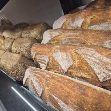 Assortiment de viennoiseries cuitent sur place, de pains et de pâtisserie.