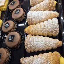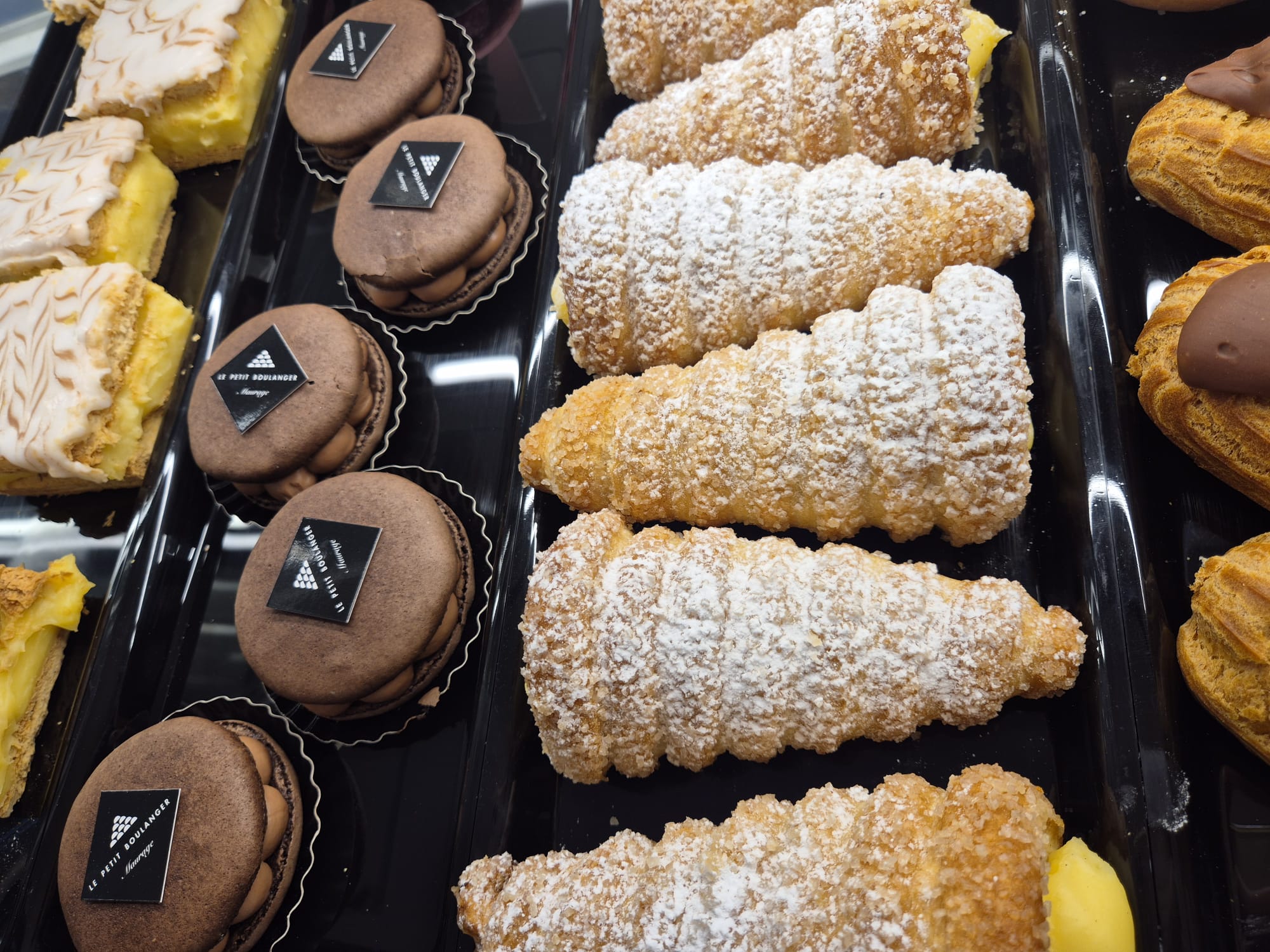 Assortiment de viennoiseries cuitent sur place, de pains et de pâtisserie.